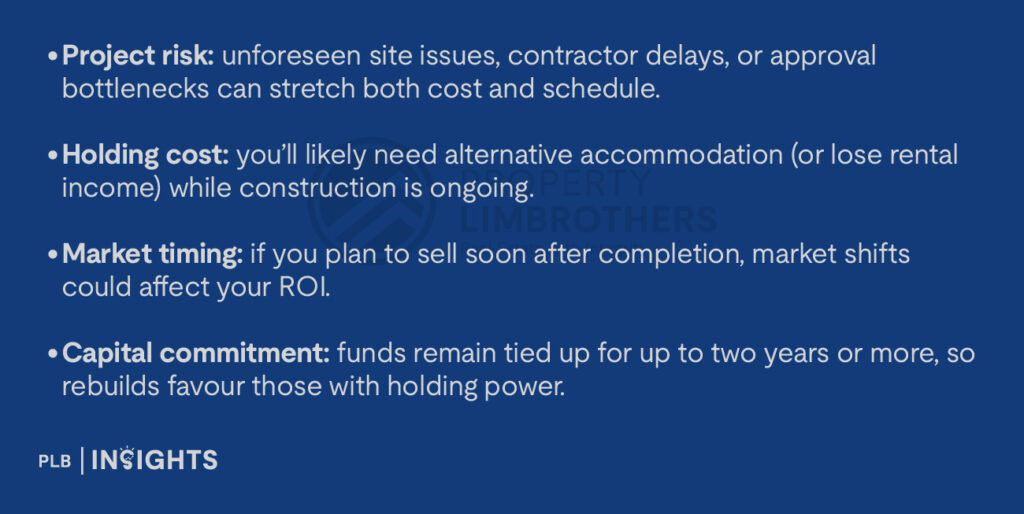 A poorly executed rebuild can underperform just as easily as an outdated ready home. Conversely, a well-maintained, thoughtfully designed property — whether rebuilt or not — can command strong resale interest even in slower markets.
