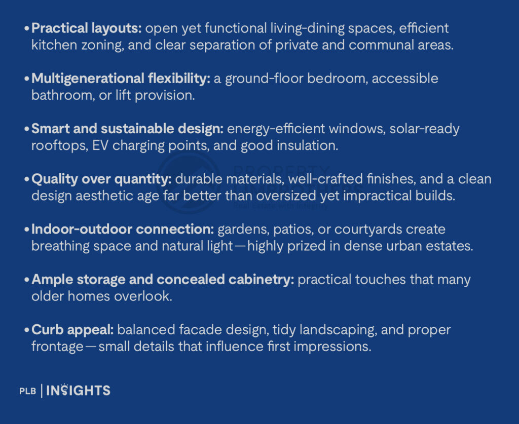 Whether you buy a ready-to-move-in home or rebuild, value in the landed segment is increasingly driven by design longevity and lifestyle fit. These are features that will appeal to future buyers: