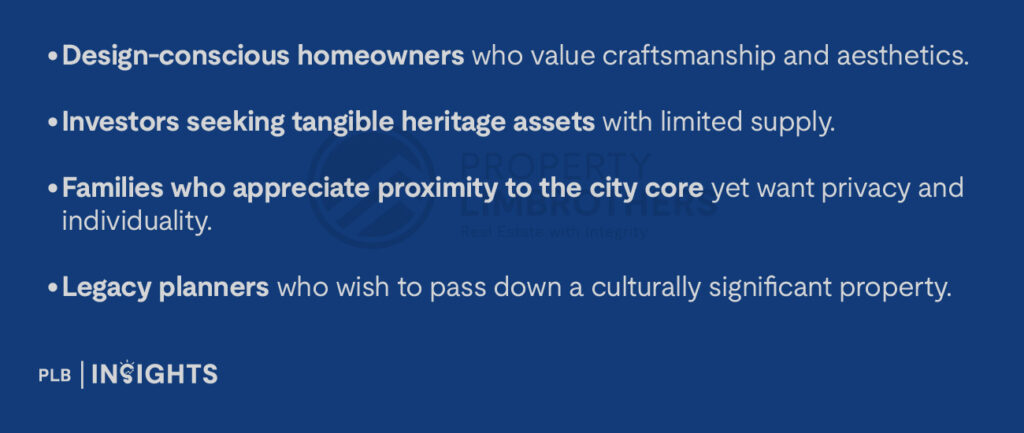 The key distinction lies in purpose and emotion. Buyers of pure landed homes typically focus on space, functionality, and rebuild potential, while conservation home buyers prioritise story, heritage, and individuality.