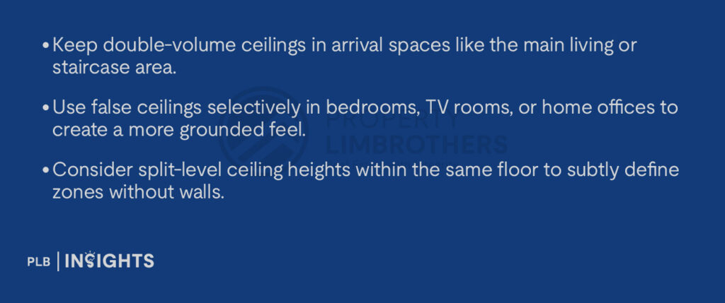 High ceilings create a sense of grandeur and formality. They work well in entrance foyers, dining rooms, or double-volume living areas where gatherings and conversations happen. However, when every space is tall and open, the home can feel echoey, impersonal, and tiring to live in daily.