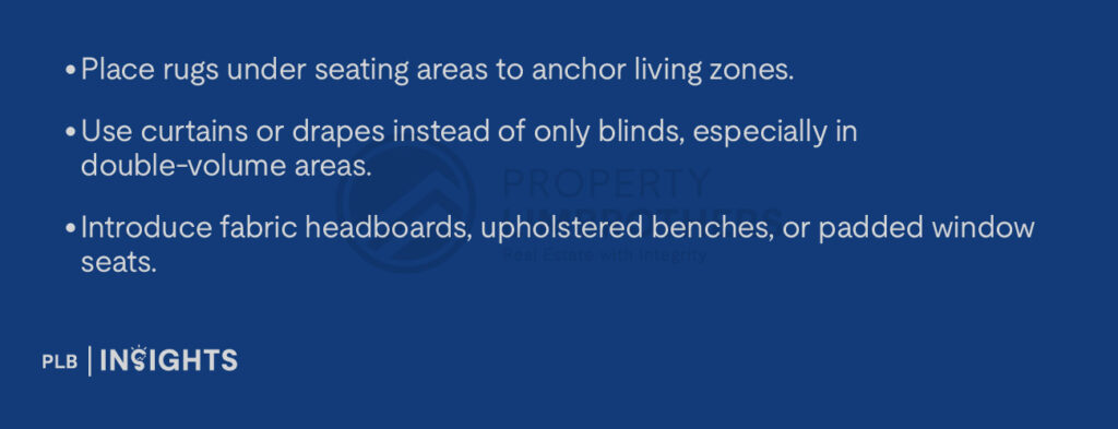 Fabrics soften both sound and mood. They help absorb noise, define zones, and make spaces feel more lived-in.