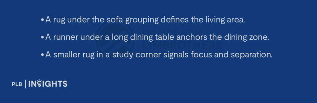 Open-plan living is common in landed homes, but without boundaries, spaces can feel undefined. Rugs act as invisible walls, helping people instinctively understand where one function ends and another begins.