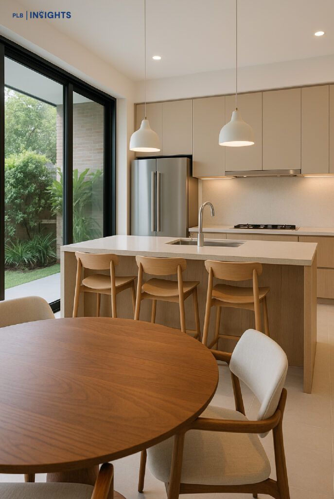 Think of the kitchen not just as a cooking zone but as part of a larger social hub. It’s where kids do homework, guests linger, and weekend meals begin. Allowing that visual openness keeps the home’s rhythm unified — especially important in inter-terraces, where natural light and air circulation rely on a seamless spatial relationship between front and back zones.