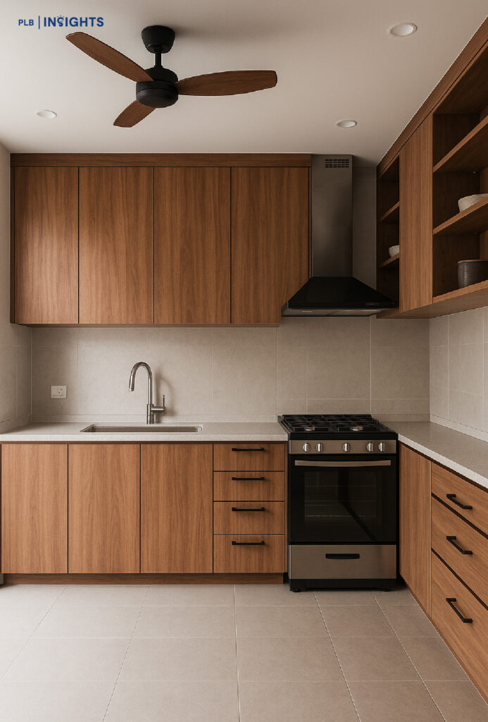 If your layout forces traffic through this zone, reconfigure the entry points or consider a galley-style design with clear separation between the working and walking paths. In long, narrow landed plots, this not only improves safety but also makes cooking far more enjoyable. The flow should feel natural, not crowded — where every step has purpose.