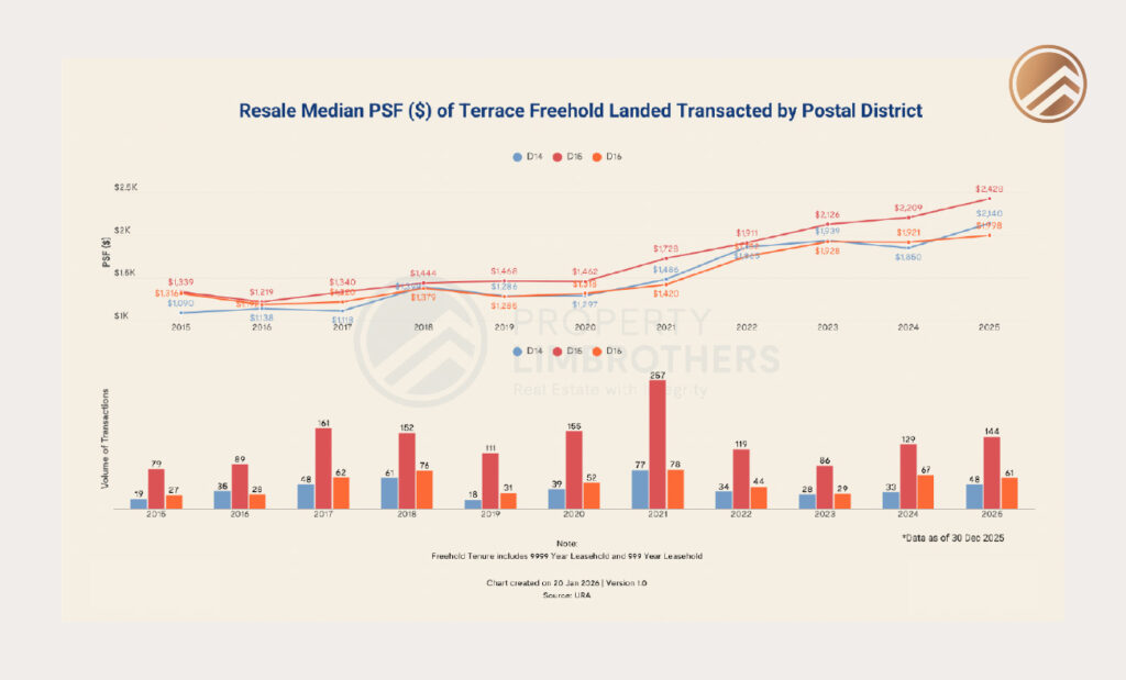 District 16, by contrast, sits at a lower price ceiling. While terrace homes here still benefit from overall landed scarcity, buyers tend to place stronger emphasis on absolute affordability and land size rather than address-driven premiums.