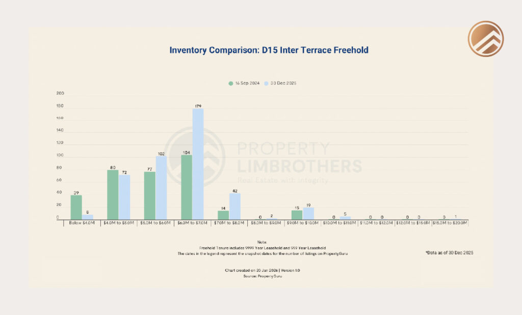 In District 15, inter-terrace listings tend to cluster within a relatively narrow price band. This concentration creates a competitive environment where buyers have multiple comparable options. As a result, pricing power within this segment is uneven. Homes that are well-positioned in terms of layout, orientation or street quality continue to transact smoothly, while those that are less differentiated often face longer marketing periods or price negotiations.