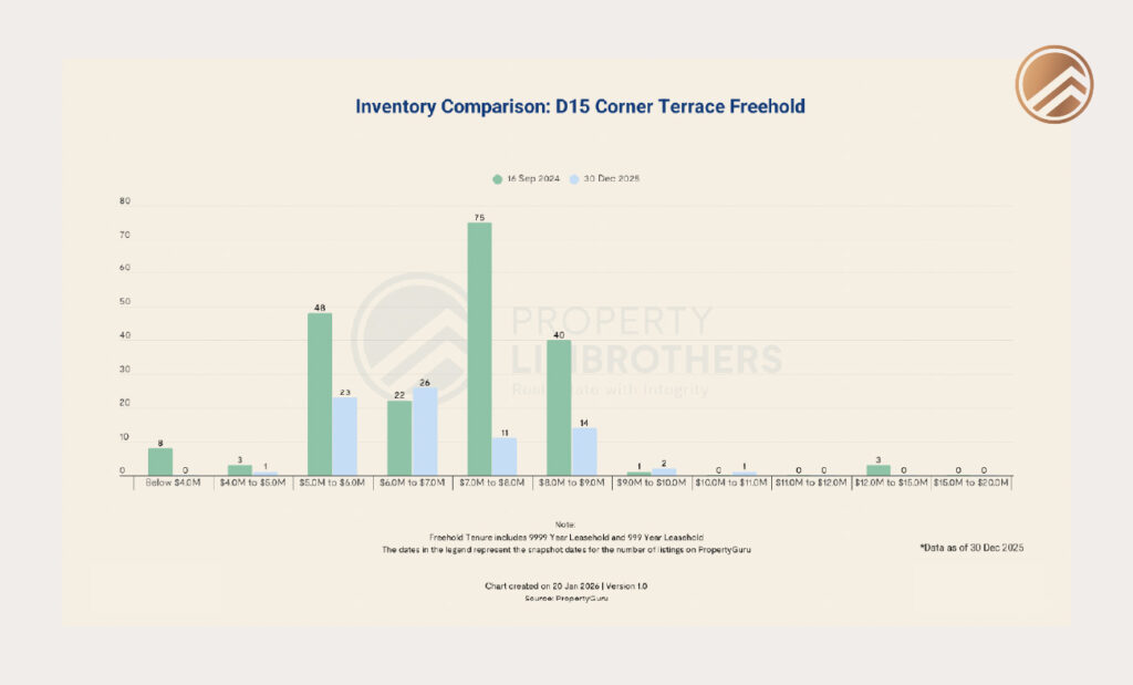 In District 15, corner-terrace supply is comparatively limited. This scarcity has helped support price firmness even as inventory has increased across other landed segments. However, lower supply does not automatically translate into faster transactions. Corner-terrace homes tend to see wider pricing dispersion and longer marketing periods, particularly when sellers price aggressively.