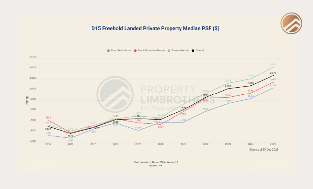 In District 15, higher prices persist despite smaller median land areas for terrace homes. Buyers appear willing to accept less land in exchange for perceived lifestyle advantages, connectivity and long-term resilience.