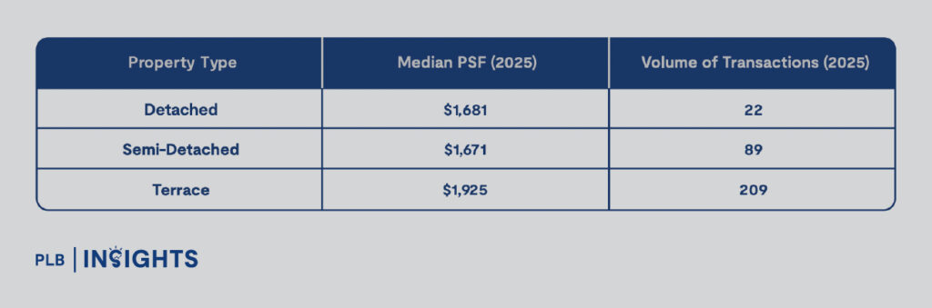 Terrace homes account for more than half of all landed transactions in the district. This dominance reflects their position as the most accessible entry point into landed living, particularly for HDB upgraders and first-time landed buyers.