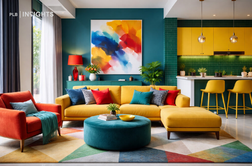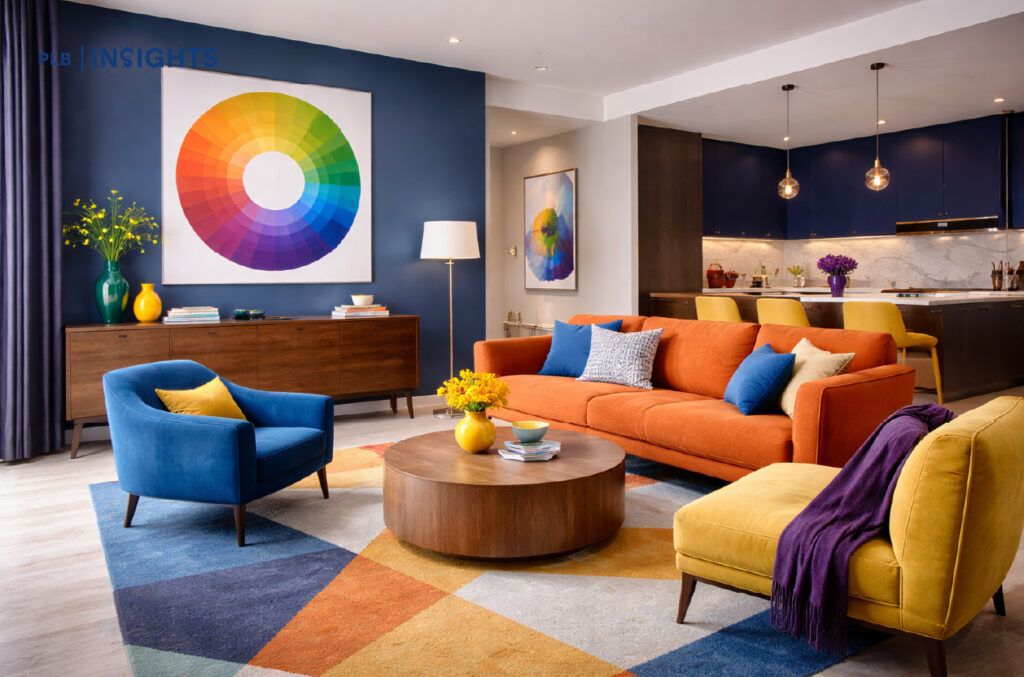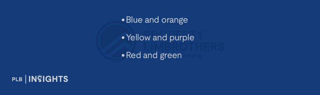Using complementary colours increases visual contrast, which makes spaces feel more dynamic and energised.