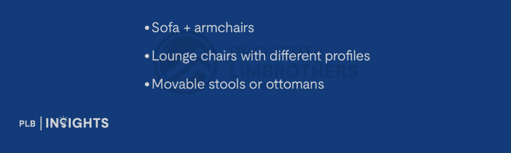 Different seating types also add softness and texture — think cane, upholstered lounges, timber accents — making the space feel curated and lived-in, not staged.