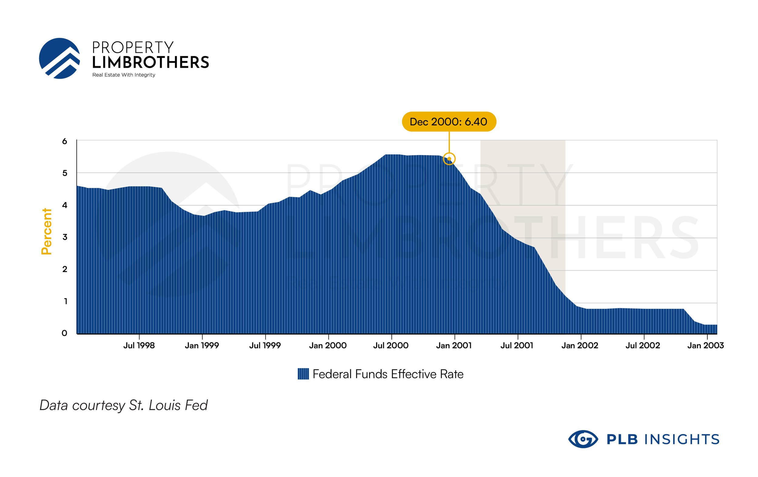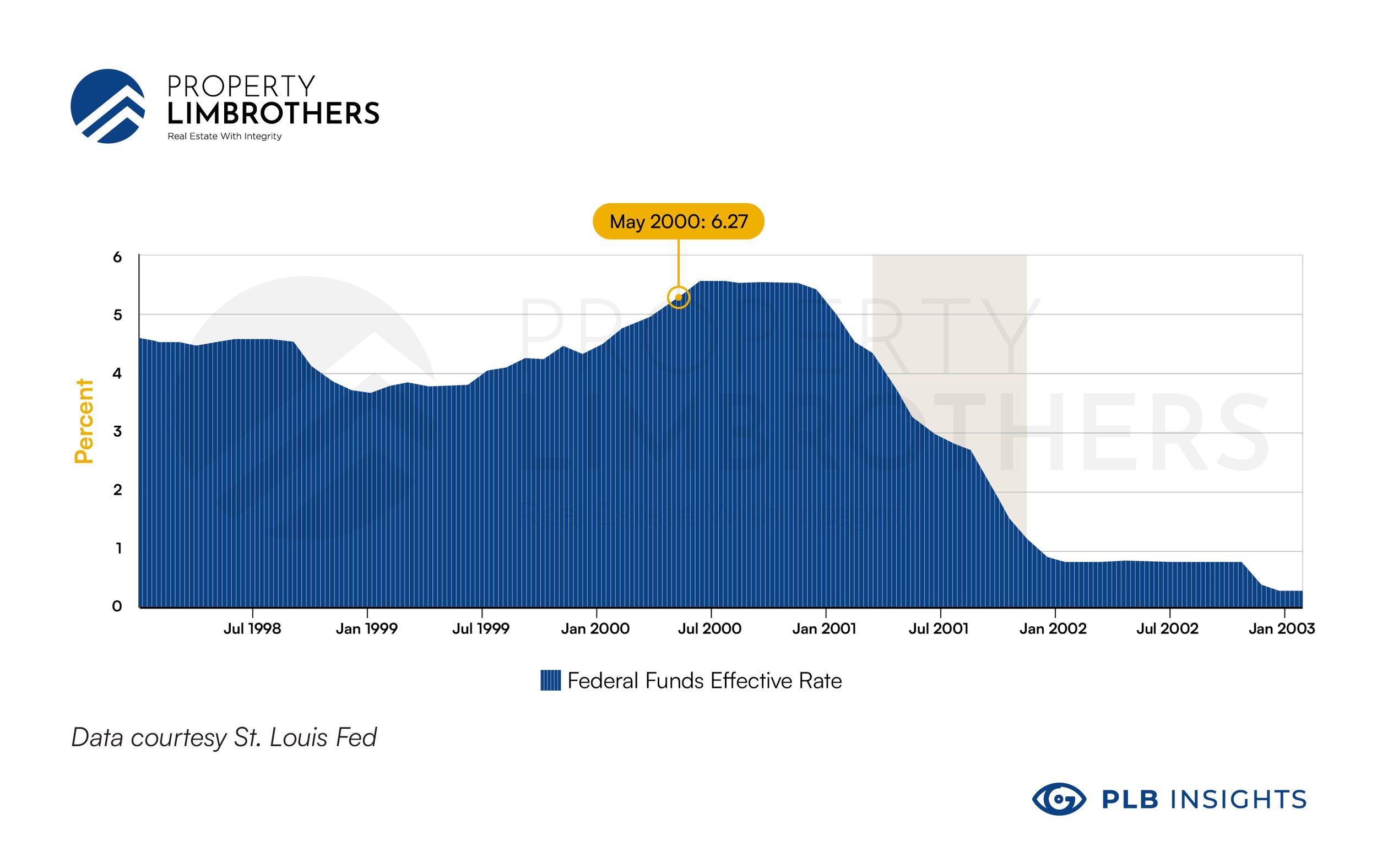 In 2000, the interest rate hike did not last long. This might be due to the already low inflation then, around 3.3%. The interest rate hike back then only lasted a short period of time, ending around December of 2000. Thereafter, we see a sharp decline from 6.4% to below 2% by the end of 2021. This steep decline in interest rates was to help encourage companies to invest in technology after the Dot.com bubble crashed investor confidence.