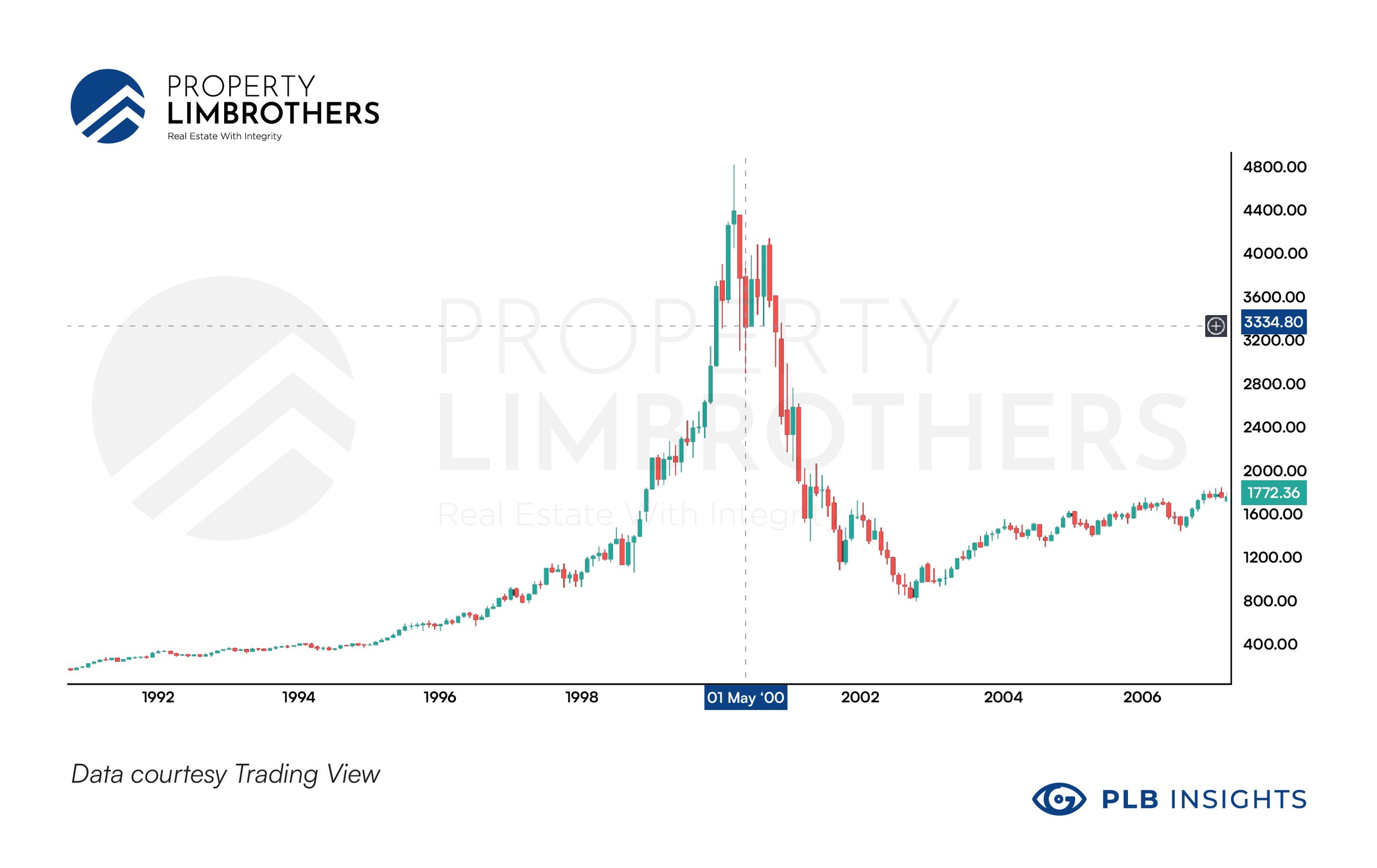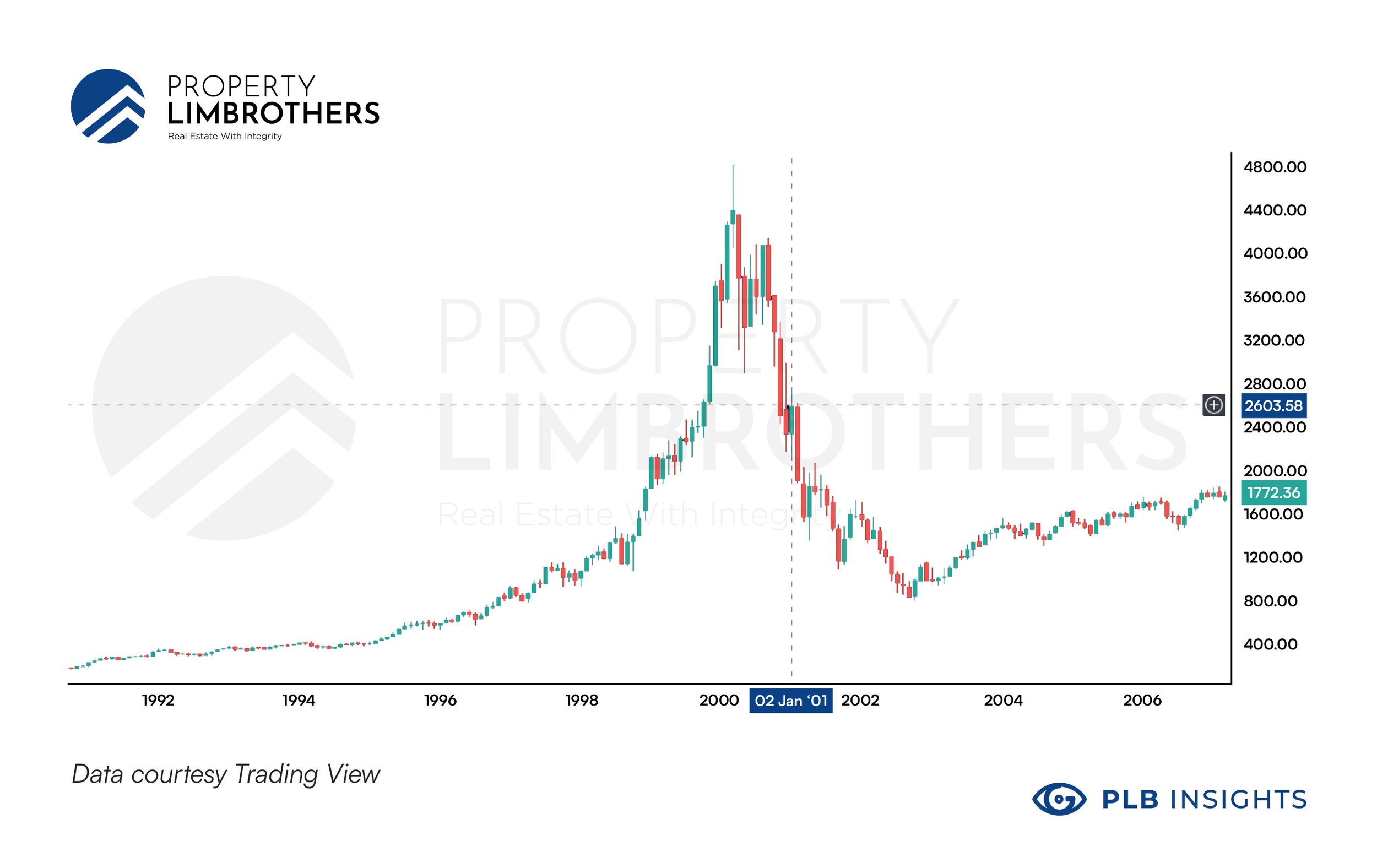 On the other hand, property prices are comparatively less volatile than other asset classes through interest rate changes and market crashes. This might be owed to the nature of the asset as a physical home and also the longer transaction processes. Through the Dot.com crisis of the 2000s, we see property prices remaining strong. Since it was mostly the tech sector and high interest rates that pushed down equity prices, the housing market kept climbing and acted as a safe haven.