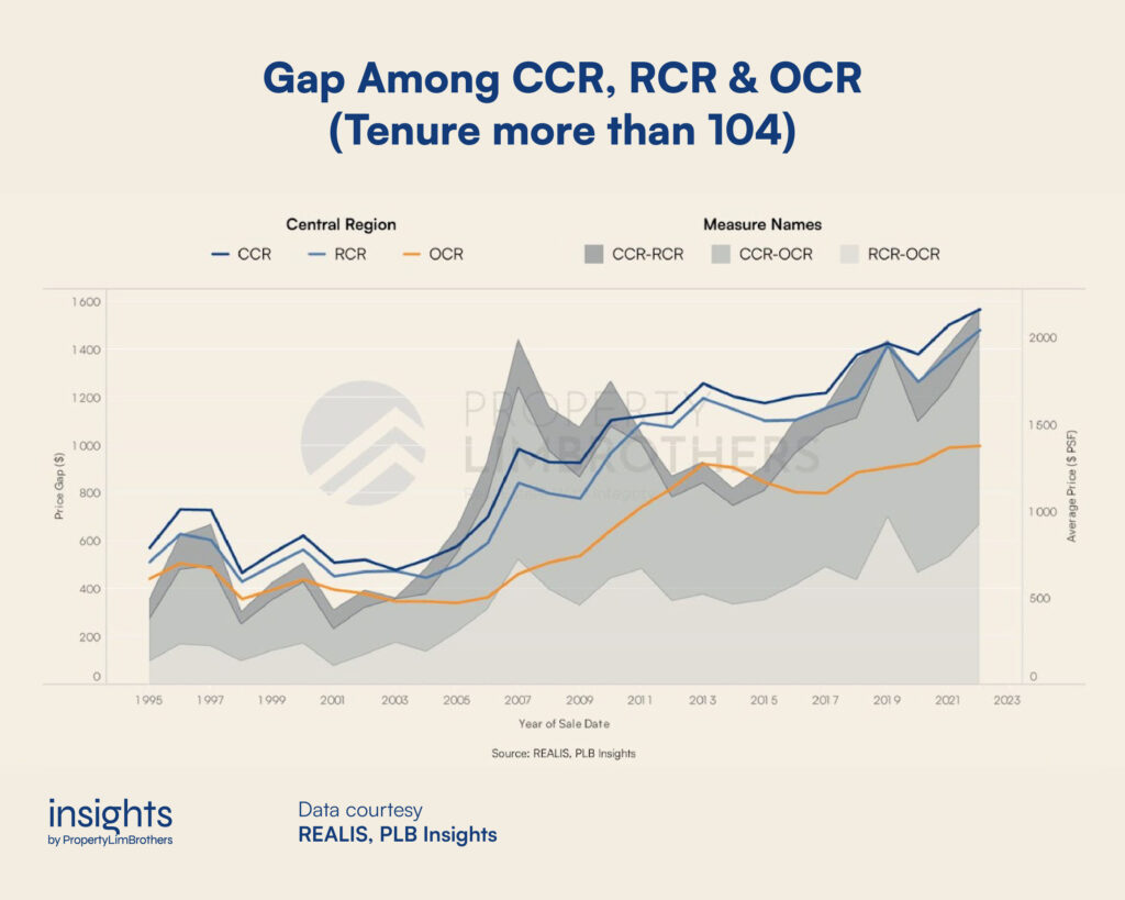 Freehold matters more in the CCR than in other regions, and might be worth more going forward. If we look at the private condominiums and apartments with a lease tenure of greater than 104 (for instance, we consider 999- year leases part of this group), the price gap between the OCR and more central regions (CCR, RCR) has been steadily increasing since 2003.