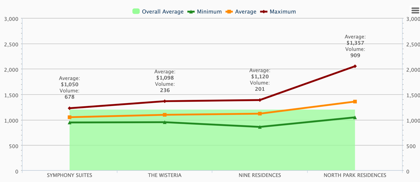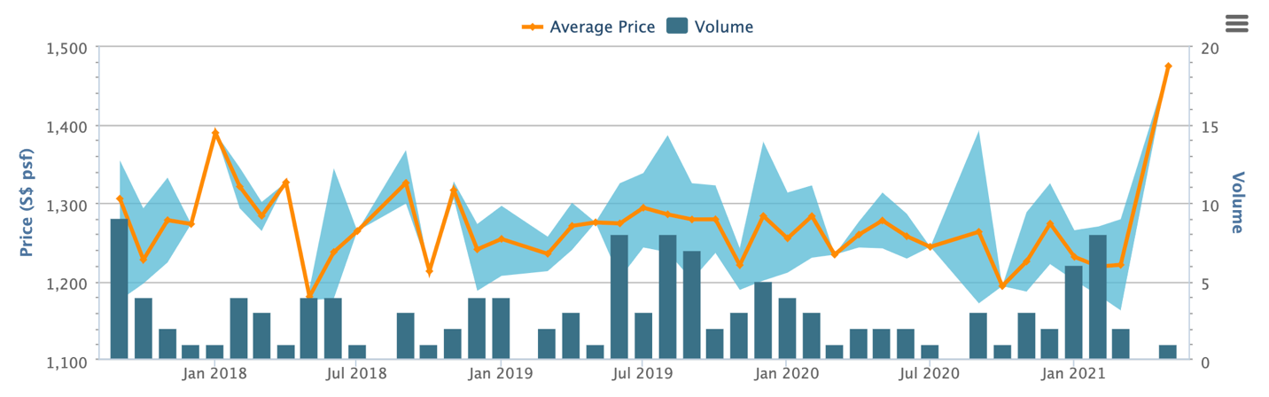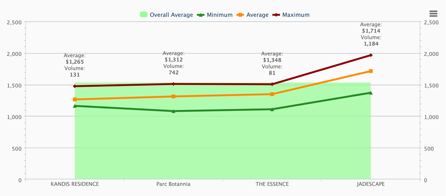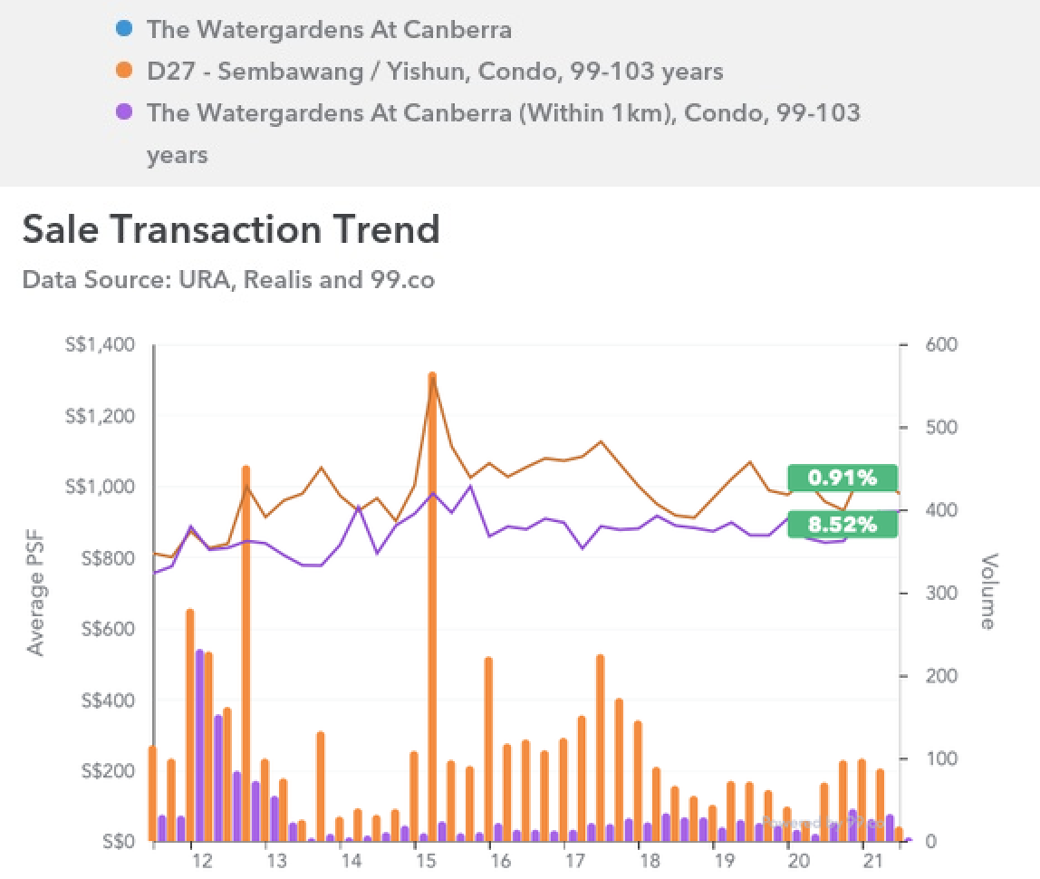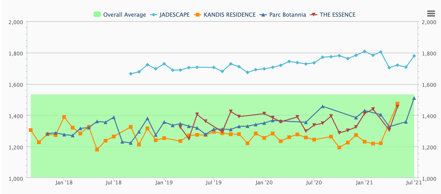 The nearby new launch, Kandis Residence’s initial launch price was set at an average of $1,250 psf. Hence, at an indicative price of around $1300 psf for Watergardens at Canberra, we would say it is pretty reasonable. Kandis Residence is a 130-unit small condominium at Kandis Link comprising four low-rise blocks. Conceptualised by award-winning architectural firm Ong & Ong, the project is designed to look like homes in the woods due to its location next to a forested area. As seen from the chart on price performance below, the Kandis Residence has been faring fairly well this year.