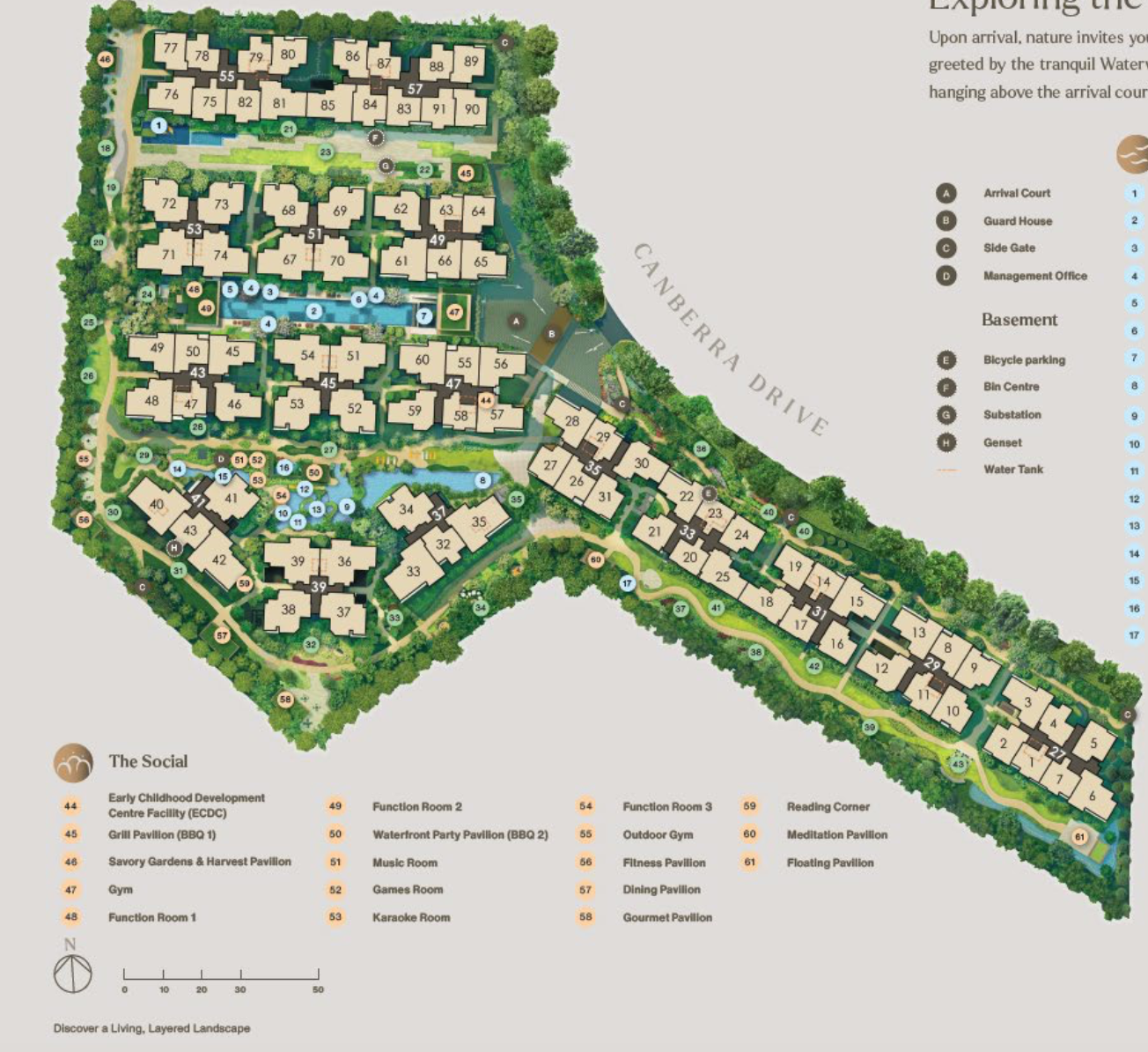 From the site plan as shown below, units at the elongated stretch facing the low-rise landed enclave are likely to be priced higher than the rest of the development. Units facing the Canberra Drive and the newly completed HDB flats are likely to be priced lower.