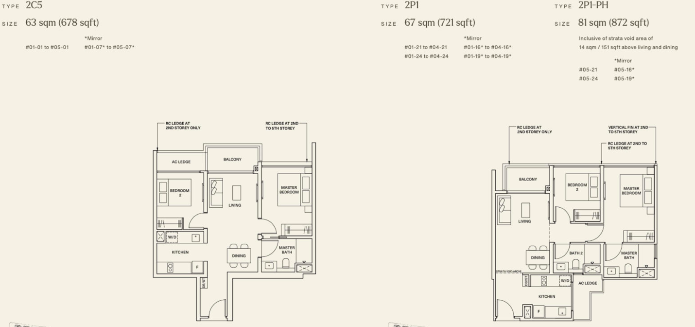 The 2-bedroom premium layout offers an efficient and unique design. In Type 2P1-PH, we have 2 bathrooms and the bedrooms seem to be fairly large. This unit has a sizable balcony and a rather spacious living room. The appliances are from Electrolux, Grohe, Franke, Monic, Inspirione, Geberit, Hager. According to the developer, the ceiling height of the living room is 2.79m which is considered generous. We also understand that the common bedroom is sized at 9.9 sq. meter which is quite rare in today’s recent developments.