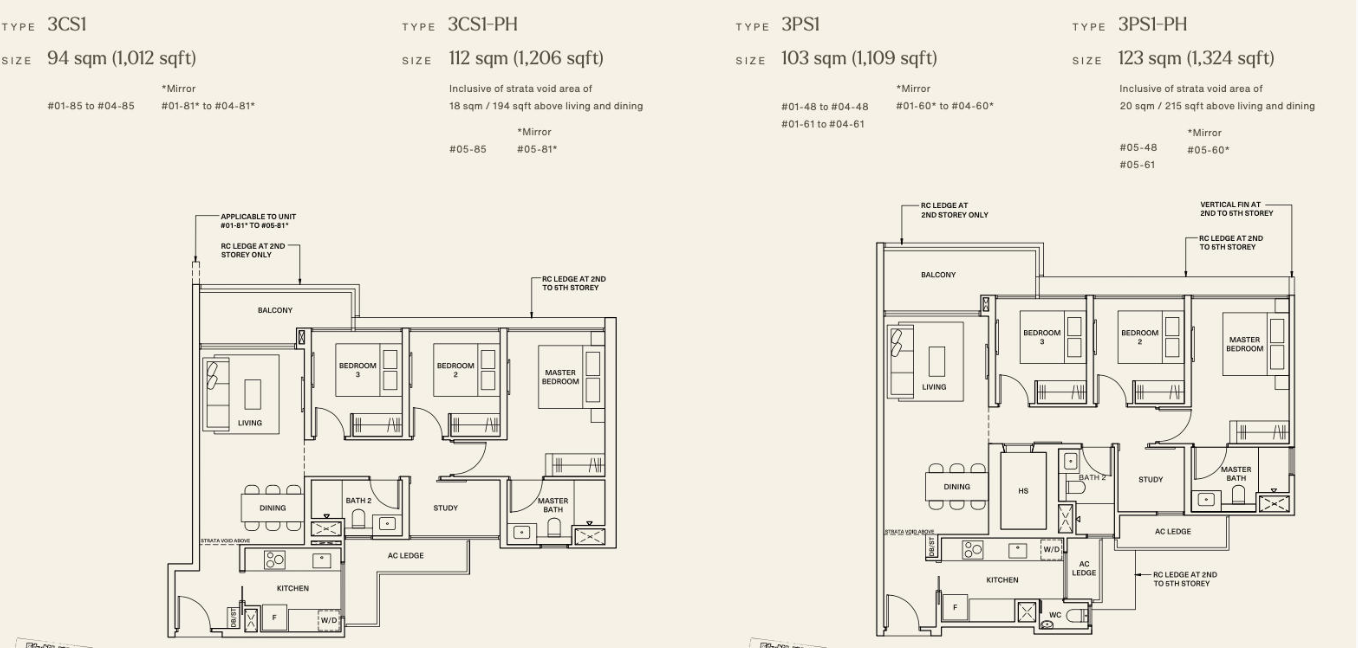 This 3 bedroom + study unit is sized at 1012 sqft, which some might find it to be quite small in today’s context. We would say it is pretty standardized. Do note there is a household shelter room and a balcony which may be considered as underutilised space. We also understand from the developer that the balcony size for a 3 bedder (958sqft) is 7.7sqm. This is quite a decent size.
