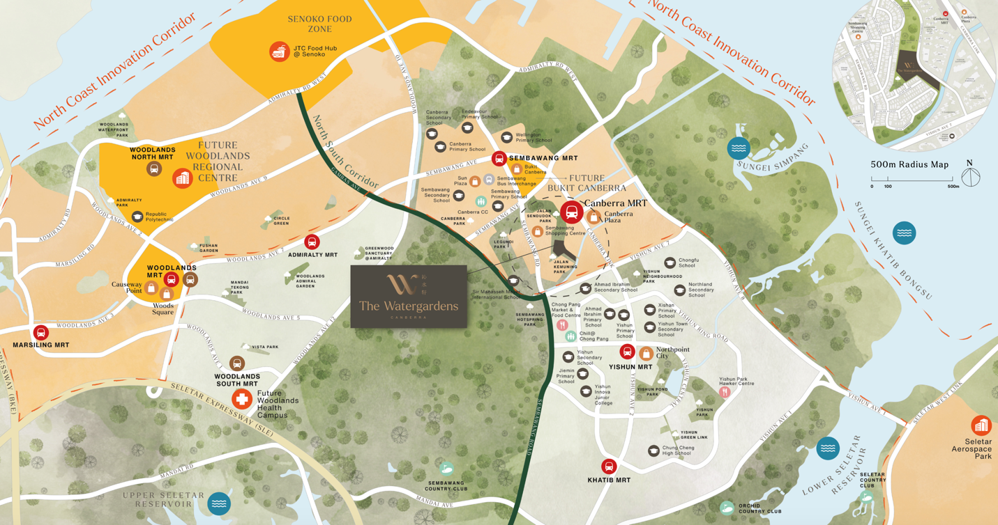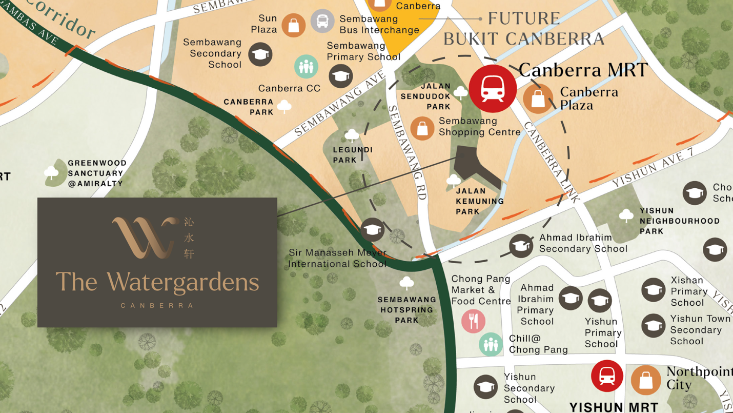 Watergardens at Canberra is located within the mature estate of Sembawang, in the northern part of Singapore. This neighbourhood has been fast-evolving with new developments. It is also enriched with its iconic hot spring and parks (Jalan Kemuning Park and Canberra Park) to preserve its rustic charm.
