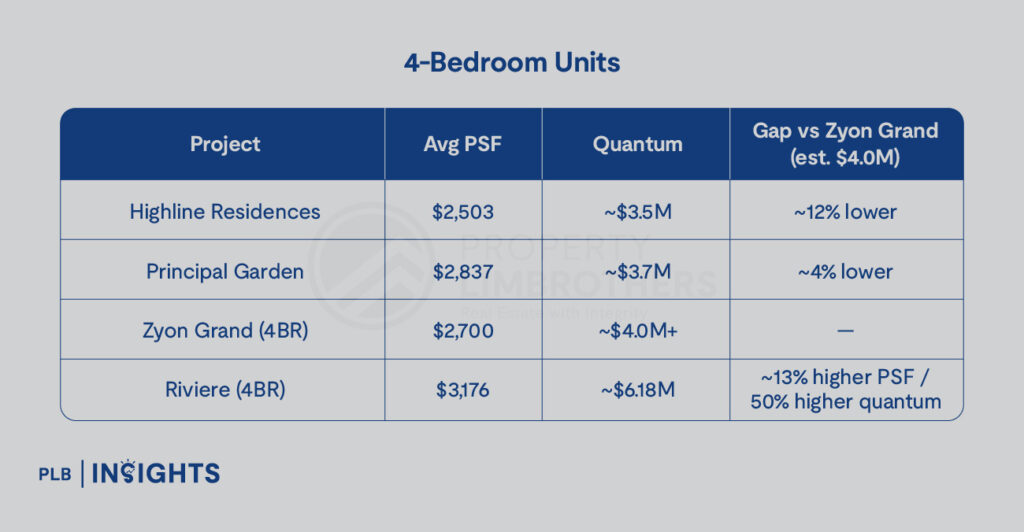Zyon Grand’s broader mix of 1BR+Study (~$1.29M) to 5BR (~$5.99M) allows multiple entry points across demographics. Riviere’s high base quantum makes it less attainable for first-time buyers or dual-income families.