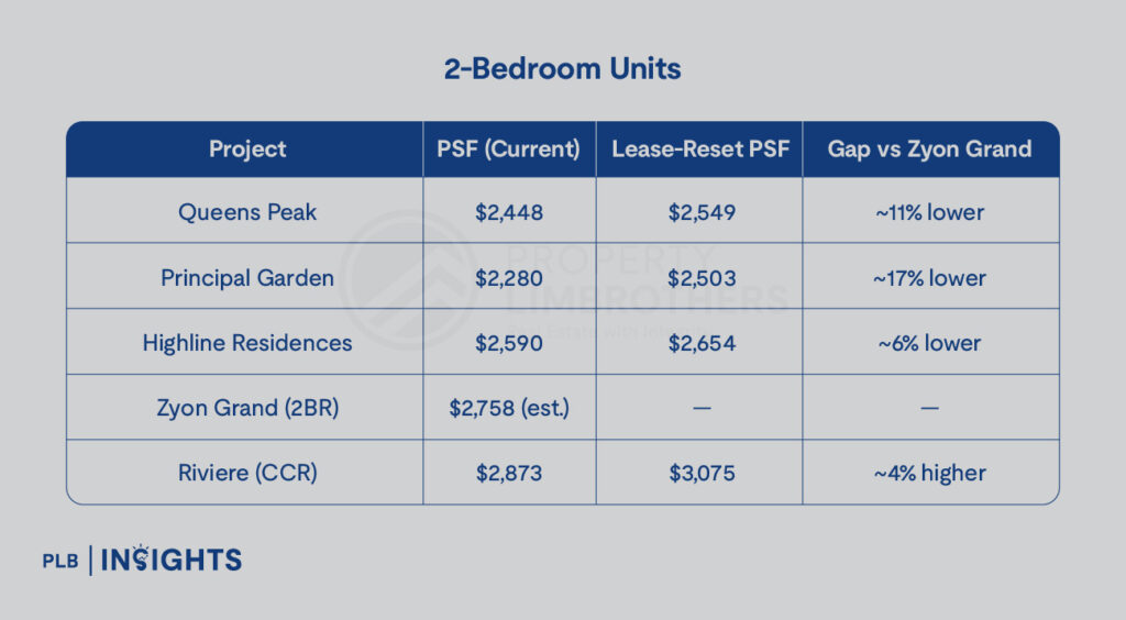 While Riviere is already transacting at ~$2,932 psf, Zyon Grand launches at a lower base (~$2,472 psf) — giving it room to rise as nearby projects like One Pearl Bank and Promenade Peak push $2,900+.
